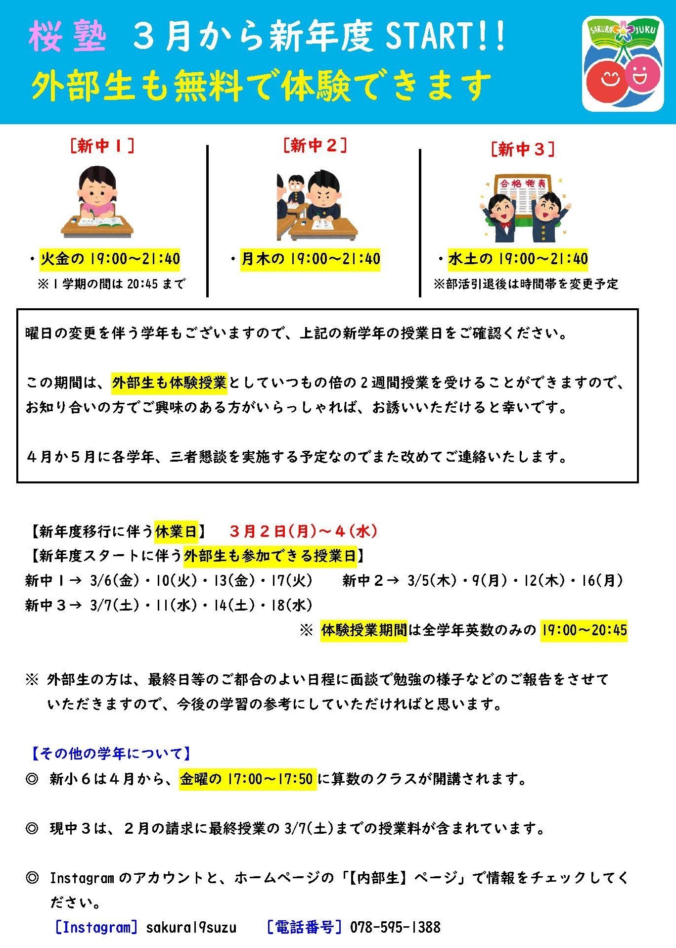 新年度 体験授業【2026年 3/5(木)~18(水)】