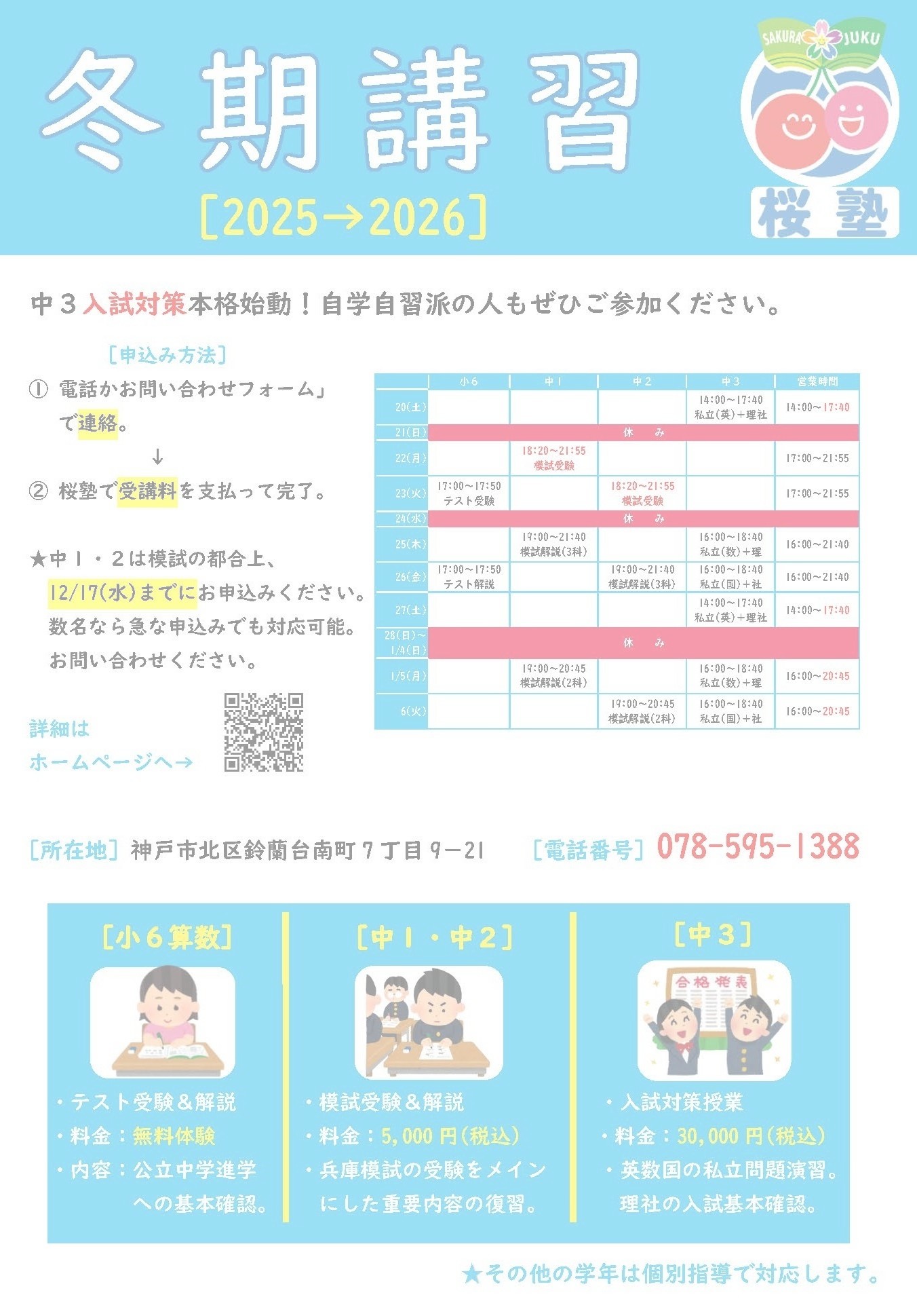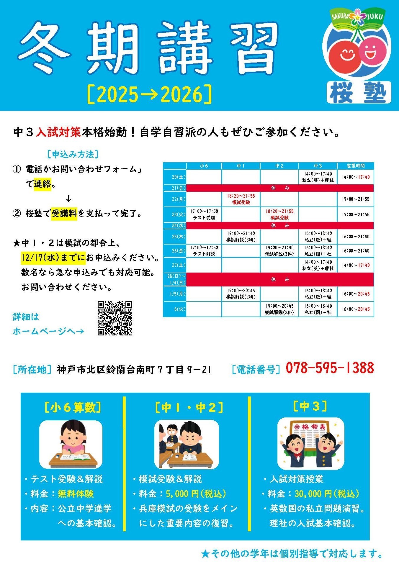 冬期講習は各学年以下の通りです。お気軽に何でもお問い合わせください。